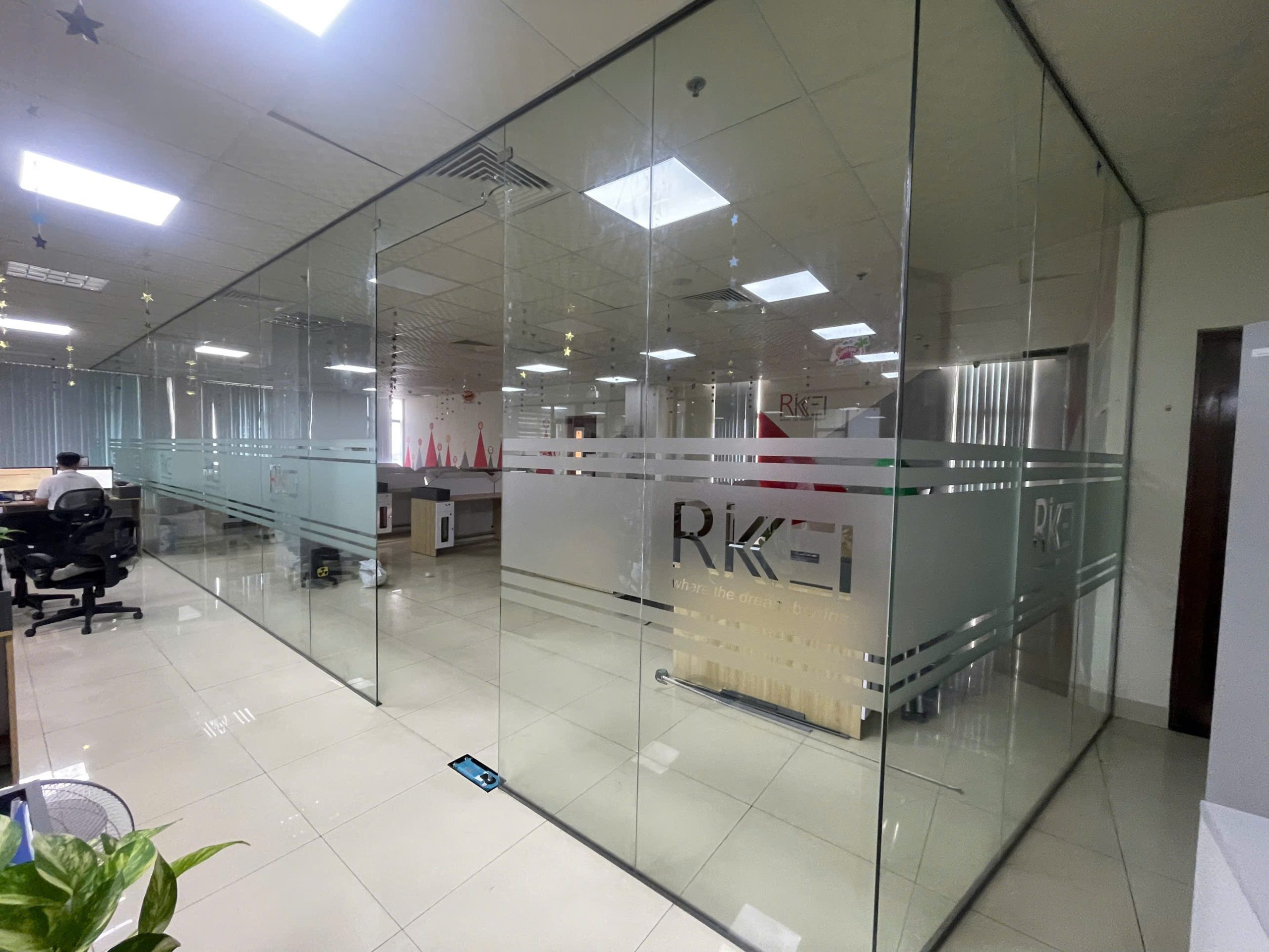 Cắt dán decal logo vách kính cho công ty RIKKEISOF Đà Nẵng.