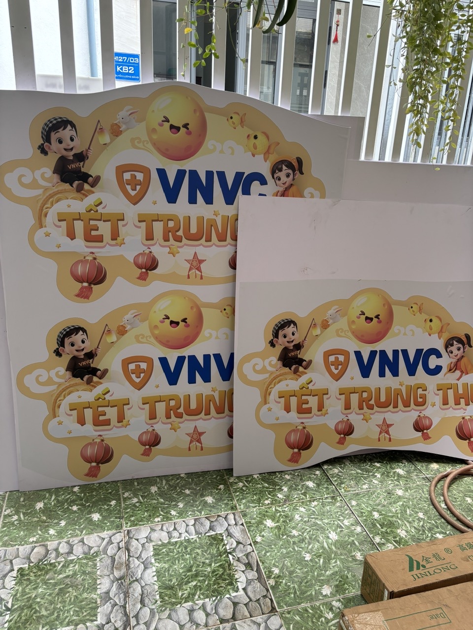 In dán decal lên fomex chủ đè trung thu cho các trung tâm tiêm chủng VNVC.